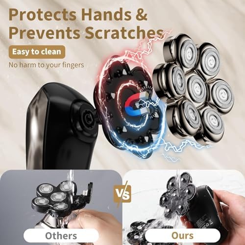 I am impressed with the SHPAVVER 7 head shaver because it shaves closer than the other shavers and is just as comfortable. The head is easy to clean just pop up the heads twist to remove the center head and wash under running water with the provided brush. This powerful shaver is IPX7 waterproof design caters for both wet and dry use, supporting shaving with foam or water. Also it makes short work cleaning up body hair. It does a great job on facial hair especially with the 5 replacement shaver heads, smooth texture, hair trimmer, nose hair trimmer, massage brush, cleaning brush which will make it close shave and quick. Battery is powerful and full charge lasts for weeks. I recommend SHPAVVER detachable 5 in 1 Rotary Razor Shaver.