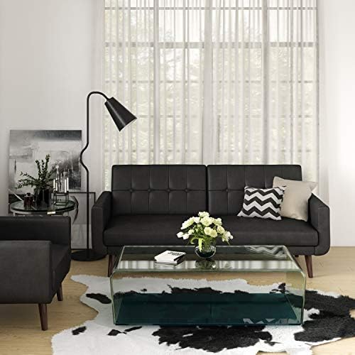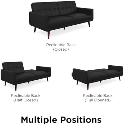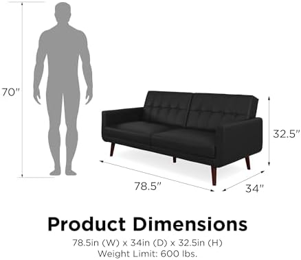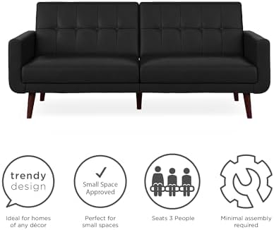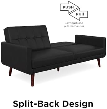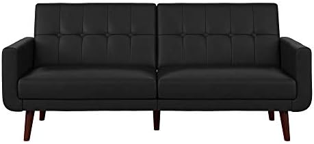 The DHP Nia Modern Futon is bringing back mid-century style with a modern twist. This stylish sofa bed is the perfect addition for any small living space. Upholstered in an eye-catching faux leather, the charming Nia has a tufted back and tapered wooden legs. This multi-functional piece was brilliantly designed with a split back design that provides you three distinct positions of comfort. Depending on your needs quickly convert it into a lounger or sleeper - ideal for any last minute overnight guests. Can comfortably accommodate up to two people. What's more, its sturdy wood construction has wide track arms that provide additional comfort in a fashionable way. Can support up to 600lb in maximum weight and ships in one box. Little assembly requires make this furniture setup easy and fast. To help complete the look of your home, the Nia Futon could also be paired with the matching Nia Modern Chair.
