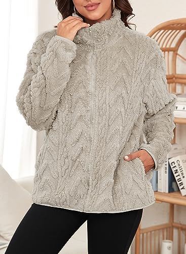 Dokotoo Fleece Jacket for Women Zip Up Windproof Long Sleeves Stand Collar Front Pockets Oversized Outwears