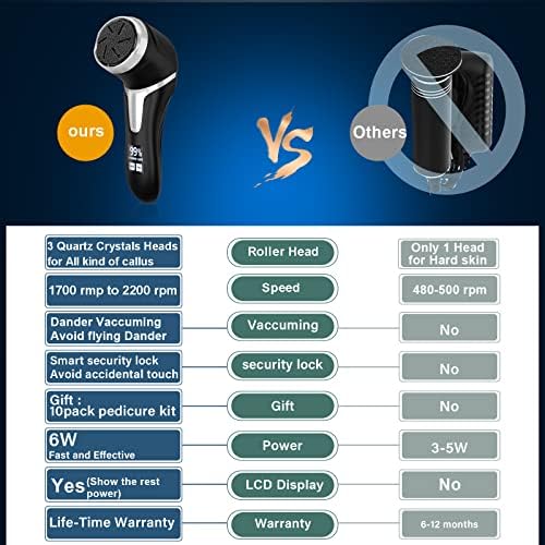 1.WithVacuum cleaner: powerful callus remover with dander vacuum cleanerquickly sucks away foot scraps, cle.an and hygienic, and sucks whilegrinding. dust-free, and foot scraps will not be scattered everywhere,an essential function for people who has cleanliness.