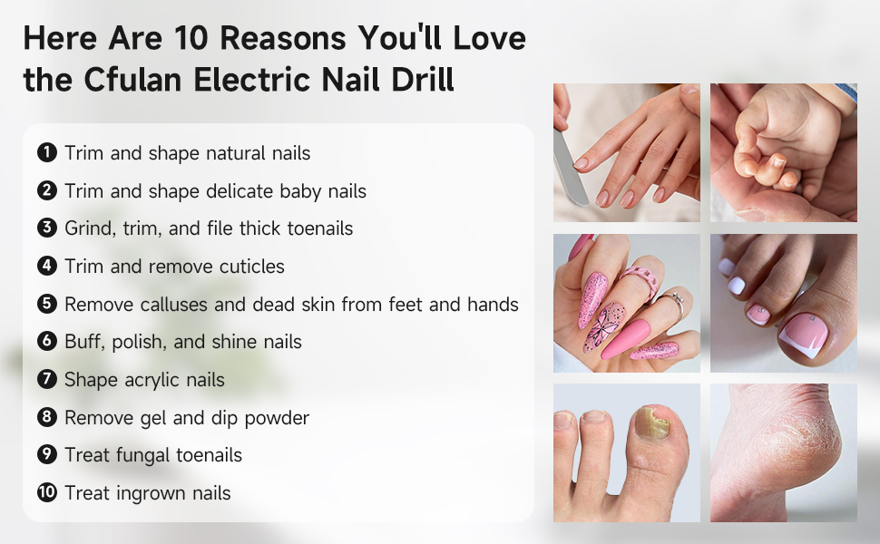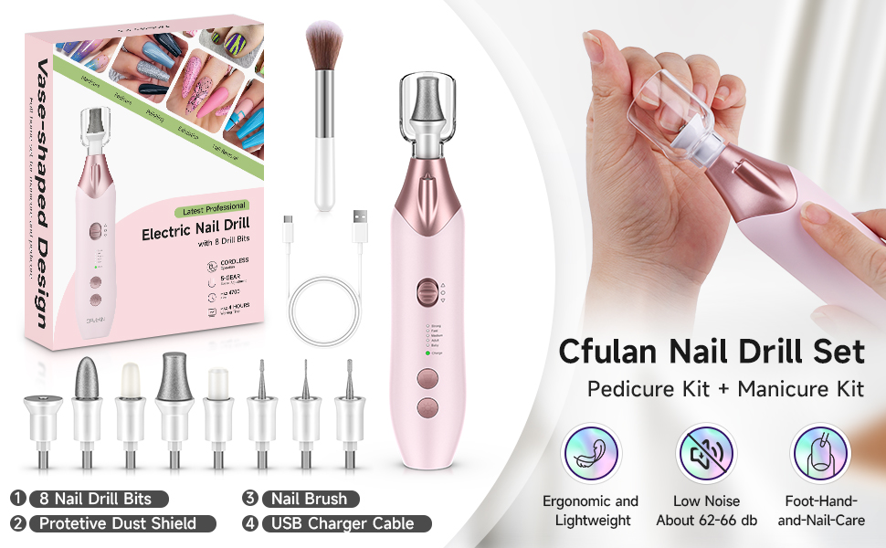Cfulan is committed to providing you with high-quality electric nail file kits for manicure and nail care at home. The portable and high-end packaging allows you to easily put the manicure and pedicure kit in your bag when traveling, and enjoy the experience of a nail salon anytime, anywhere. The newly upgraded manicure and foot polish 2-in-1 professionalnail drillcan meet all your manicure needs and is also a creative gift for female friends.