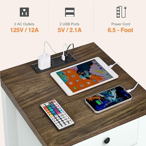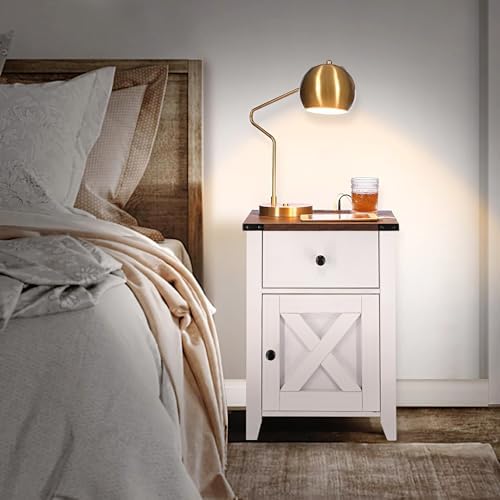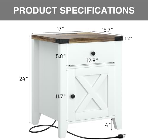 GAZHOME End Table with Fast USB Charging Station, 24” Tall Sofa Side Table with Drawer, Large Storage Rustic Wood Square Storage Cabinet for Living Room,Bedroom,Office, White