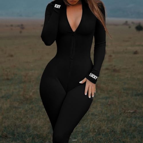 This One Piece jumpsuit feature long sleeve, turtleneck with zipper design, solid color, high cut, high waist, Letter print at the finger sets, slim fit jumpsuit, long romper bodycon bodysuit.