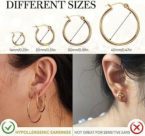 I have extremely sensitive ears and most earrings cause inflammation & irritation…but not these! They never irritate my ears and are lightweight - I can wear them all day long without even feeling like I have them in! They come in different sizes depending on the occasion or mood you’re in. High quality metal and they’ve kept their shine and color (despite having showered with them in)My new go-to hoops