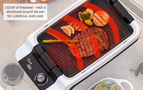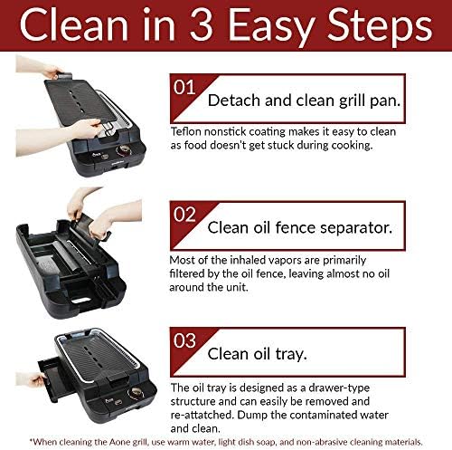 Smokeless, electric grill for cooking delicious food indoors, with just the push of a button. Using Aone Grill’s proprietary technology, most of the oil and dust are filtered through the grill, leaving your home smoke and odor-free. **PLEASE NOTE** The most common troubleshooting issue we hear from customers is that the fan does not work or the grill does not heat up. When reassembling the grill after cleaning, make sure the arrows on the silver tray are facing the control panel. If the tray is not assembled properly, the grill will not heat up and the fan will not work. Material: Aluminum Teflon Coating / Heat Resistant Plastic / Stainless Steel // Rated Voltage: 110-120V // Power Consumption: 1200W