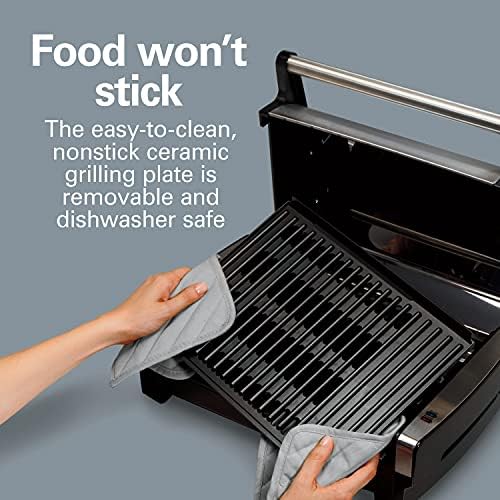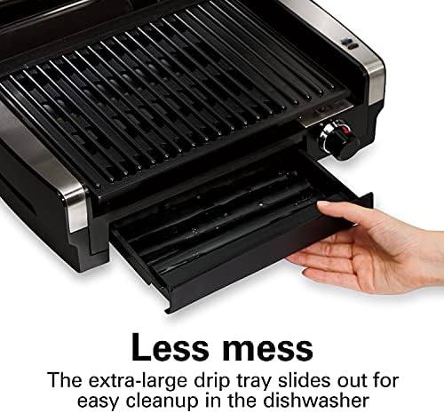 Hamilton Beach Indoor Grill makes healthy grilling at home a breeze. Temperature setting, dishwasher safe plates & drip tray. Adjustable temperature control ranges from 200 degree to high searing temperature of 450 degree.