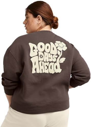 This Hanes Originals women's plus size crewneck sweatshirt is made with a soft, cotton-rich fleece designed to keep you warm without the bulk. In true crew fashion, it offers a ribbed collar, cuffs, and hem. The relaxed silhouette and dropped shoulder combine style with comfort for a look you'll love. Featuring cotton sourced from American farms, this women's fleece crew is the perfect cozy antidote to a chilly evening. The cozy pullover is finished with retro-inspired "Good Days Ahead" graphic for an extra touch of style. Pair it with leggings, sweats, or jeans for an effortlessly cool finish.