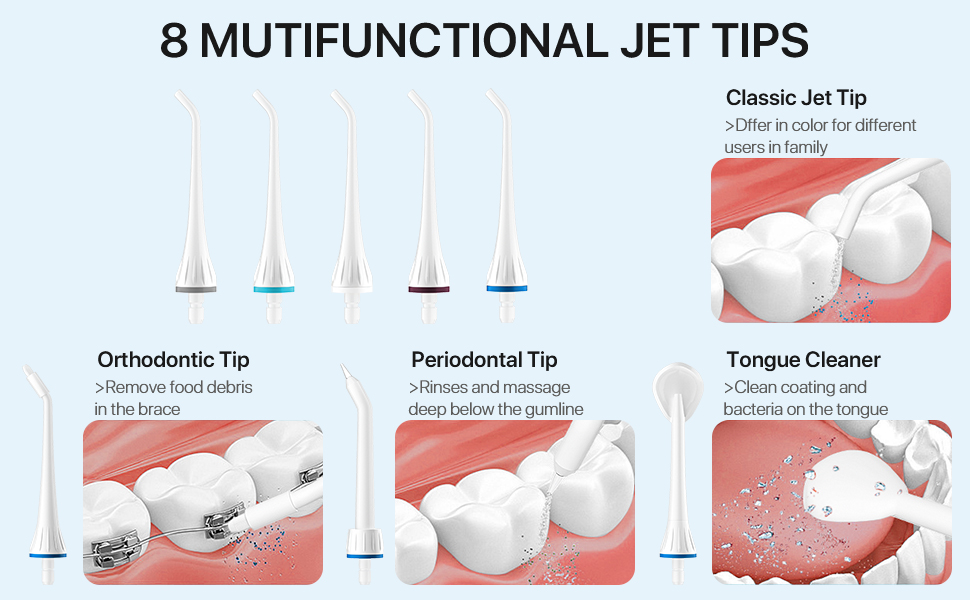 3 operation modes and 8 replaceable nozzles to satisfy daily oral hygiene needs of the whole family. The USB rechargeable design provides convenience and flexibility. Never worry about dead batteries, ideal for travel. A Professional cordless dental flosser for the whole family.