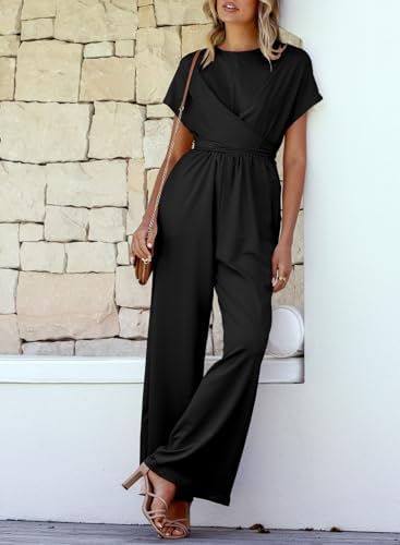 Happy Sailed Women Jumpsuits Dressy Short Sleeve Front Crisscross Tie Waist Belted Wide Leg Pant Romper with Pockets