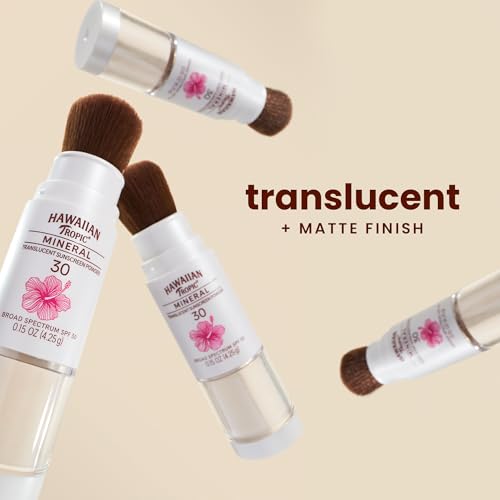 Hawaiian Tropic Mineral Translucent Sunscreen Powder Brush is a handy and convenient new way to apply and re-apply your SPF throughout the day, so you can get the daily protection you need while enhancing your look. It's your ultimate skin-loving SPF BFF! Made with naturally sourced sea minerals to absorb excess oil on your face, this portable, easy-to-use brush format works seamlessly into your daily beauty routine and can be used by itself, under makeup, or even after your makeup is on to help set it. The translucent formula blends into most skin tones to provide a beautiful matte finish, while the 100% mineral actives offer broad spectrum UVA/UVB protection without chemical filters. Plus, our sunscreen brush's convenient size makes it a perfect travel sunscreen so you can reapply throughout the day.