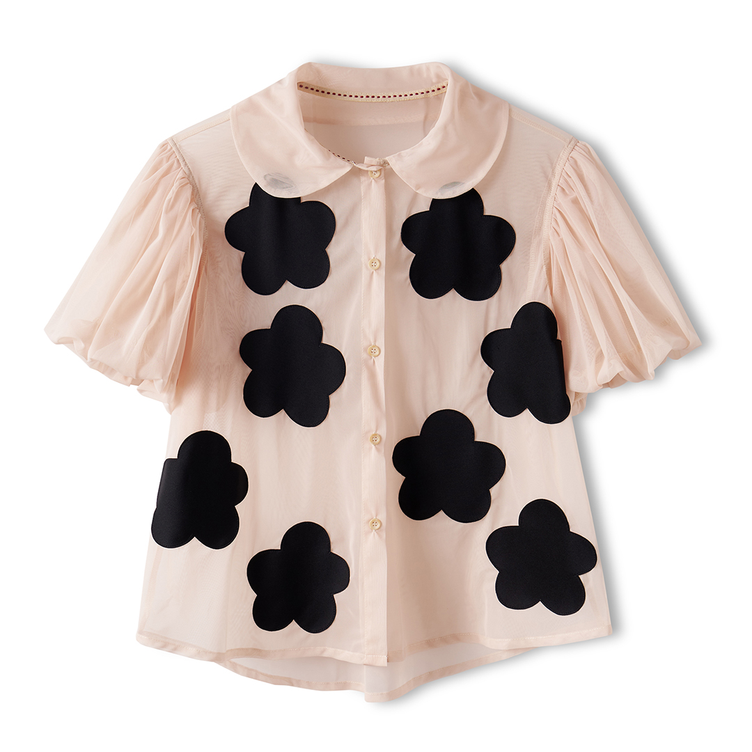 imakokoni Spring/Summer Taiwan Satin Puff Sleeve Doll Collar Short Sleeve Sunscreen Single Breasted Shirt 223603