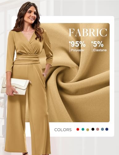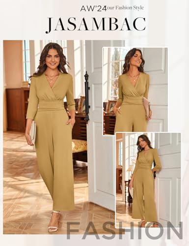 JASAMBAC 3/4 Length Sleeve Women's Jumpsuits Dressy Casual Wrap V Neck Empire Waist Romper Flowy Pants Outfits Overalls
