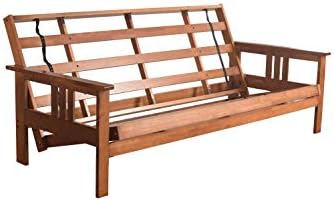 The Monterey futon features a classic hardwood frame with Mission style arms. This unique and versatile full-size futon sofa easily converts to a bed. This multifunctional piece of furniture can find a home in just about any type of room. Maximum distributed weight: 500 pounds.
