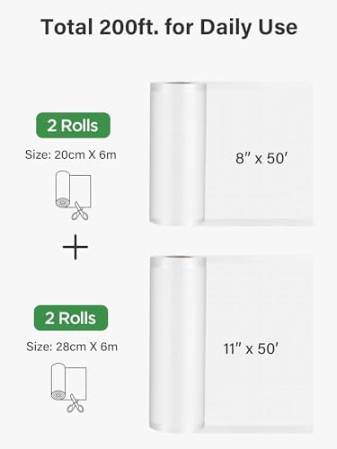 Purchasing a set of 2 rolls of 8"x50' and 2 rolls of 11"x50' vacuum sealer bags offers a cost-effective and versatile solution for your sealing needs. It enables efficient space utilization by selecting the appropriate size for each food item, reducing excess material, and optimizing storage space.