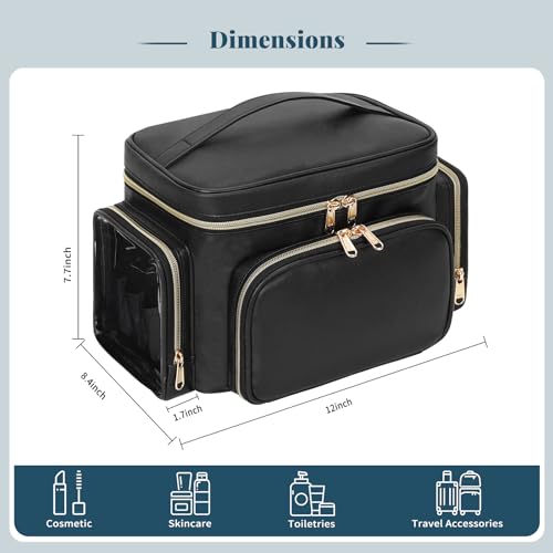 Large Makeup Bag, Portable Travel Makeup Bag Organizer for Women Girls with Makeup Brush Compartment & Two Side Pockets, Cosmetic Travel Bag Vertical Storage Toiletry Bag - Black