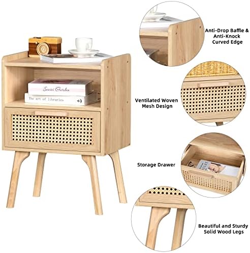 Lerliuo Rattan Nightstand, Boho Side Table with Drawer Open Shelf, Cane Accent Bedside End Table with Solid Wood Legs for Bedroom, Dorm and Small Spaces (Natural)