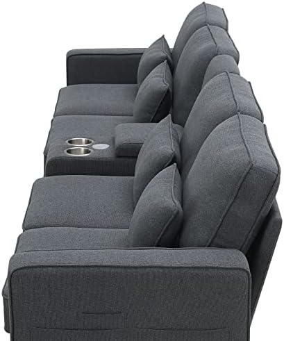 This couch is awesome! It’s comfy, in style and a great price! The couch arrived on time and in 3 boxes. Assembly took maybe an hour and instructions were simple to follow. The center console with cup holders and charging port are as pictured and is a great feature to have. Just buy it already!!