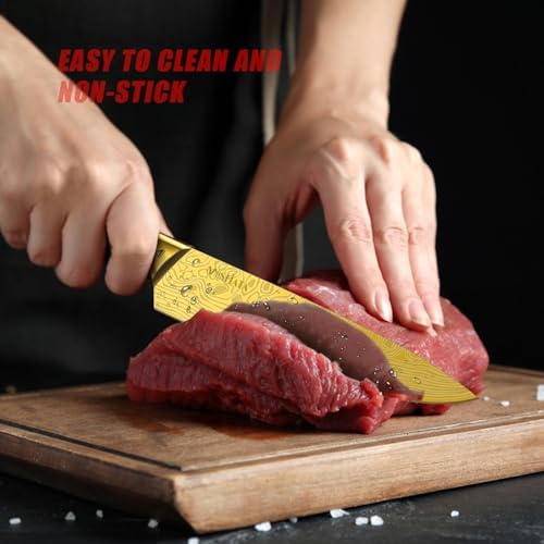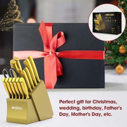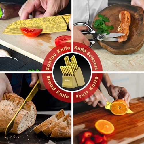 MOSFiATA Kitchen Knife Set, 17 Pcs Japanese Stainless Steel Knife Sets for Kitchen with Block with Knife Sharpening Rod, Dishwasher Safe, Gift Set,Titanium Plated Knife Block Set (Golden)