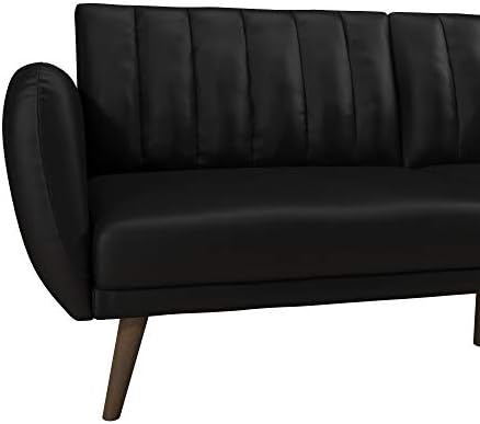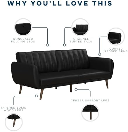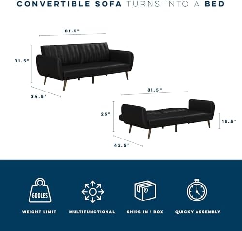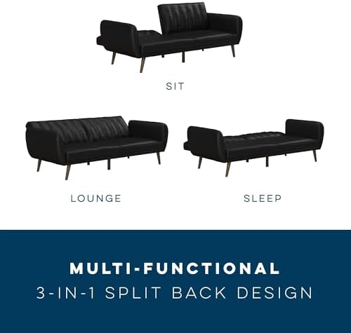 Personal style is expressive and can be transformative - nowhere is that more apparent than inside your home. For Mid-Century Modern décor enthusiasts, the Novogratz Brittany Futon is a game-changing multifunctional furniture piece that will set your living room, home office, or guest room apart from the rest. Part futon couch, part futon bed, it takes a convertible approach to relaxed living with a lowerable folding back that shifts into small sleeper bed form whenever your guests are in need and an easy push-pull split-back mechanism that expands your seating choices for versatile sitting, lounging, and sleeping comfort. Uniquely designed with ribbed channel tufting on the backrest, curved armrests, and 4 slanted solid wood legs that are felt-lined for floor protection, the Brittany's foam cushioned seat and padded arms provide a firm foundation for rest, as do its small-space plywood frame build with supportive no-sag spring backing, 2 plastic center legs, and 2 concealed fold-out support legs located within rear zippered pockets. Offered in multiple colors, the Brittany is available in both easy-to-clean linen look and faux leather upholstery options.
