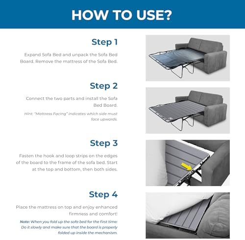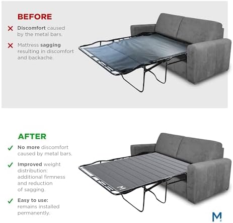 This is just what I have been looking for to improve the comfort of our sleeper sofas.During renovation of our beach house, I had to try to sleep on the pullout and it was awful, even with a gel-foam mattress, because of the two cross member bars.I purchased two of these for our existing sleeper sofas, but then we decided to replace the old sofas.I planned to put these on the new ones.However, once I put them on, with the new spring mattress, I couldn't close and stow the bed.First, it was difficult to push down the bar to fold the foot of the bed.Once accomplished, the resultant thickness prevented the bed from clearing the back of the couch.So, unfortunately, I had to return them.