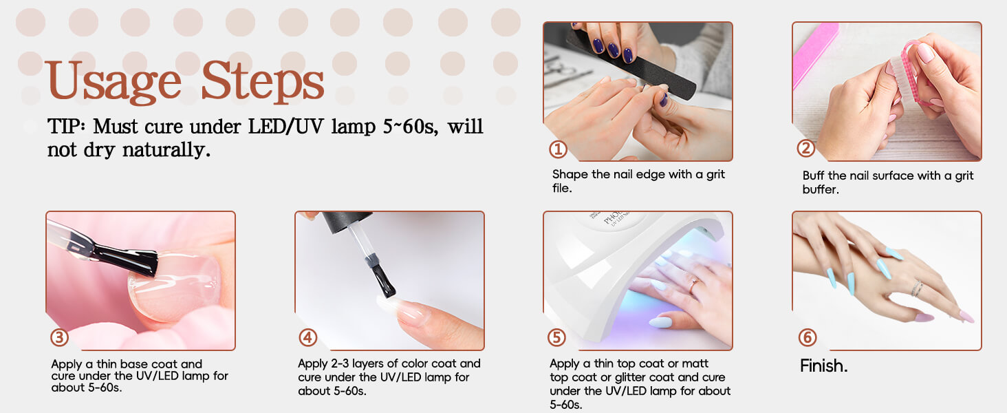 This set is very good for what the price is. Yes the bottles are small but I've done 5 sets so far and still have plenty of polish. It comes with a base coat, regular top coat, matte top coat, and glitter top coat to accommodate any sets you would like to do. The only thing didn't like is how there is no nude polish, but it's not a deal breaker. Attached is an image of a set I did with only supplies from this set other than that false nail tips.