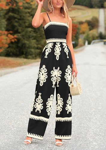 PRETTYGARDEN Women's Summer Boho Jumpsuits One Piece Beach Vacation Outfits Spaghetti Strap Wide Leg Pants Rompers