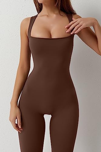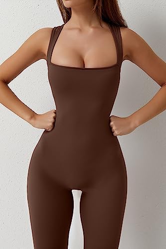 QINSEN Black Jumpsuit for Women Sleeveless Sexy Suqare Neck Stretch Flare Leggings Romper Unitard