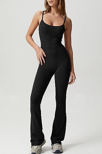 QINSEN Flare Jumpsuits for Women Spaghetti Straps Scoop Neck Bodycon Full Length Casual Unitard Playsuit