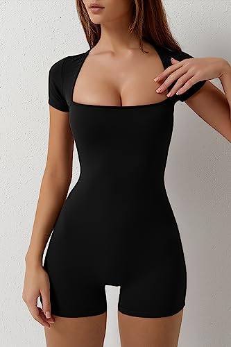 QINSEN Women's Short Sleeve Bodycon Romper Stretchy Square Neck Sexy Unitard Jumpsuit