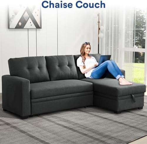 Rovibek 4-in-1 Convertible L Shaped Couch with Pull Out Bed and Storage Sectional Sleeper Sofa with Reversible Chaise for Living Room, Apartment, Bedroom, Office, Charcoal Grey