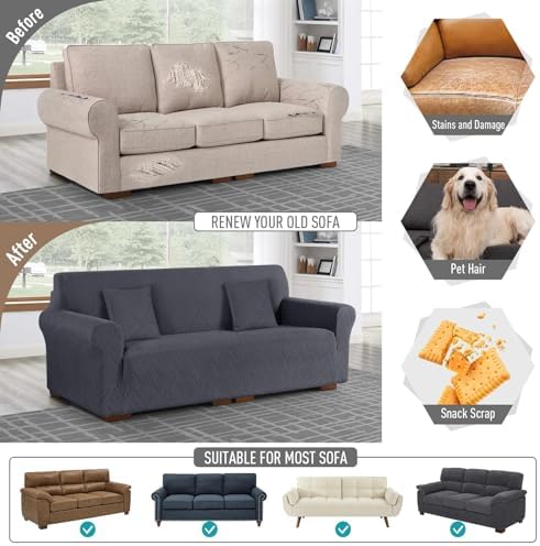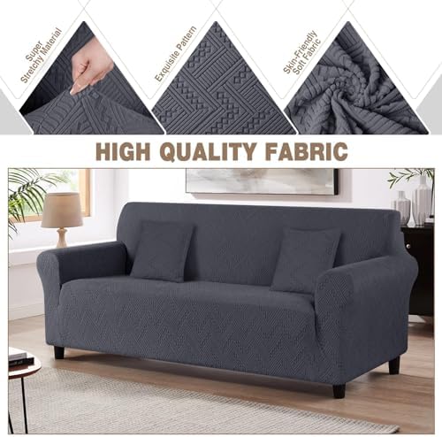 Ruaozz Stretch Sofa Cover 1 Piece Couch Covers for 3 Cushion Couch Non Slip Sofa Slipcover Washable Soft Jacquard Furniture Protector with 2 pcs Throw Pillow Covers (3 Seater, Dark Gray)