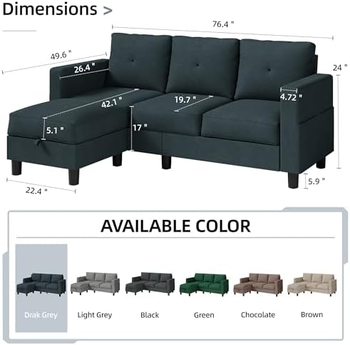 Shintenchi is devoted to delivery a tender and fancy living environment to every customer. We have our own factory, reduce middlemen, can provide you with the most cost-effective products in the same kind of products, to ensure your comfortable life experience. And our indoor sofas are ergonomically designed to fit the curve of the back and relieve the pressure on the back, suitable for a variety of space and style, to meet your needs. You can enjoy a coffee in the morning sun, a tea after lunch and a wine in the night. Our sectional sofa is not large, so it can be a solution for buyers who have small space and need a beautiful sofa! Specifications Color: Dark grey, Light grey, Chocolate, Black, Light Brown,Dark BrownFrame Material: MetalSeat Height:16.9 Inches Tips Instructions before buy 1.Please confirm whether the size of our products meets your requirements before you buy it2.Please note that there is a little color difference between the object and your monitor