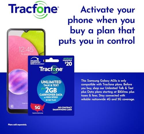 Get a phone that’s as affordable as it is awesome with Samsung Galaxy A03s by Tracfone. With a large 6.5-inch Infinity-V display, this smartphone provides a vibrant and immersive visual experience, perfect for streaming videos and browsing your favorite content. Equipped with a powerful quad-core processor and 32GB of internal storage (expandable with a microSD card), the Galaxy A03s ensures smooth multitasking and ample space for photos, videos, apps and more. Capture stunning photos with the triple-lens 13MP main camera and take selfies that pop with the 5MP front-facing camera.With Tracfone now you're in control with no contracts and stay connected with reliable nationwide 4G and 5G coverage. Enjoy unlimited talk & text, plus Unlimited Carryover Data* that never expires so you can get the most from your wireless plan.