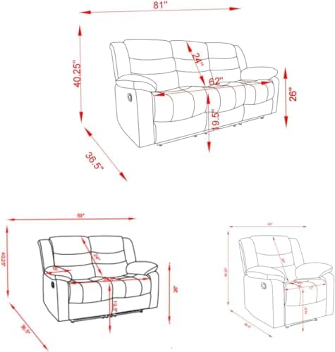 Seat Height 19.5" Seat Depth 20.75" Seat Width 17"/39.5"/62" Handrail height 26" Armrest width 10" Back inside height 24" Handrail front lift 2.5" Armrest 4.75" Product Dimensions 3-Seater Sofa-35D”*36.5W”*40.25H'' Loveseat-59D”*36.5W”*40.25H'' Armchair-81D”*36.5W”*40.25H''