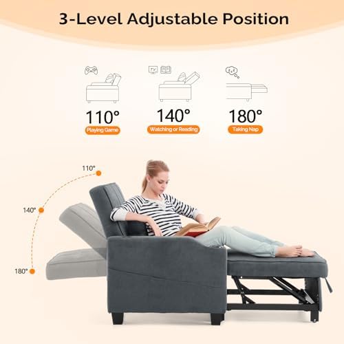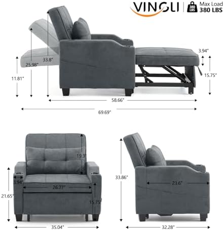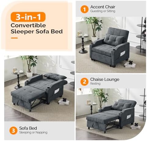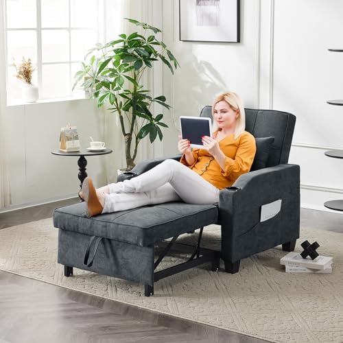 VINGLI Convertible Sleeper Chair 3-in-1 Sofa Bed, Pull Out Couch Sleeper Sofa Recliner with Adjustable Backrest, USB Ports, Cup Holders, Side Pockets for Small Space Living Room, Bedroom
