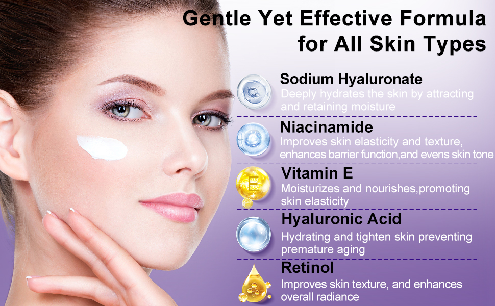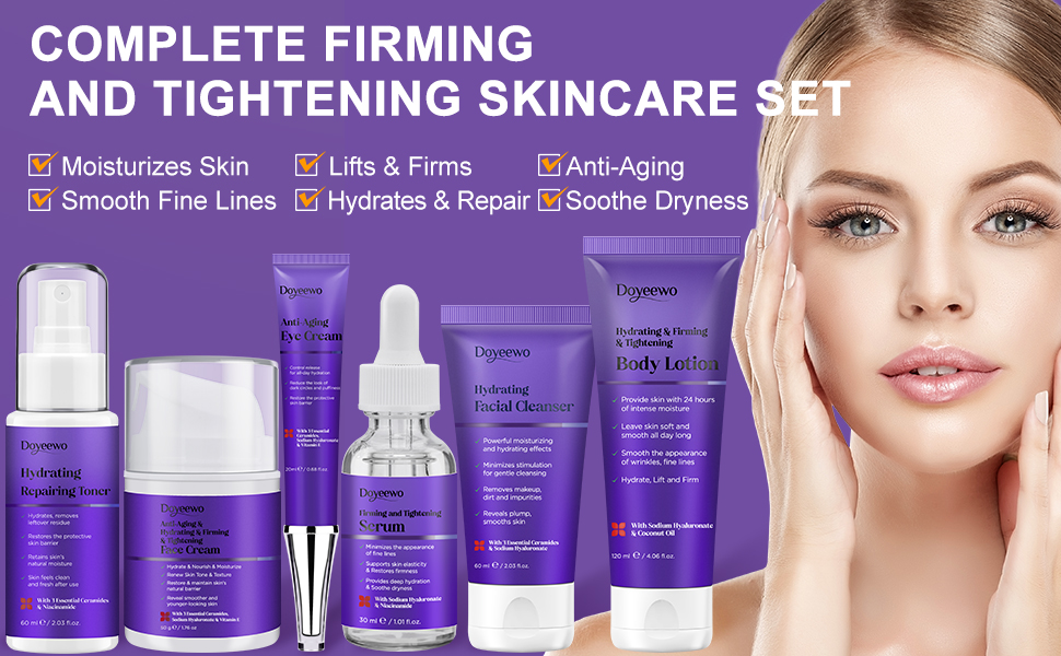 - Our skincare routine kit provides everything needed for younger-looking skin, including a facial cleanser, toner, eye cream, serum,face cream and body & neck lotion. The cleanser and toner gently cleanse and hydrate while restoring the skin barrier. The face cream, serum, eye cream, and neck lotion work together to hydrate,moisturize,anti-aging,firm,tighten,improving elasticity and enhance skin tone. Infused with premium ingredients like retinol, sodium hyaluronate, vitamin E, and glycerin, the products are cruelty-free and sulfate-free, suitable for all skin types, including sensitive skin