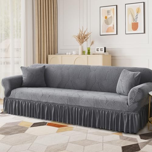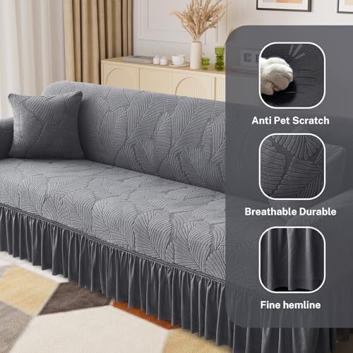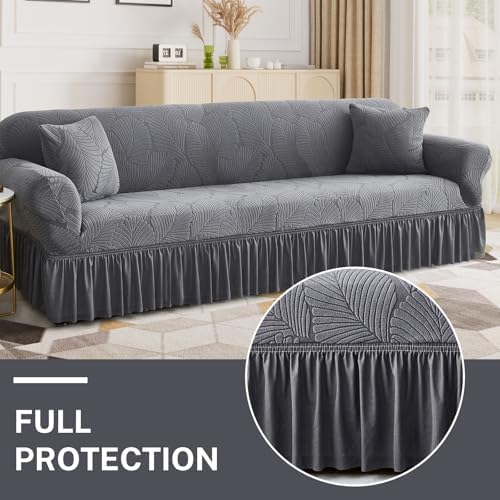 WONGS BEDDING Stretch Velvet Sofa Slipcover, Cushion Couch Cover with Skirt, Pet Friendly Durable Washable Stretchable, Easy Fit Universal Furniture Protector, (75"-91",Dark Gray)