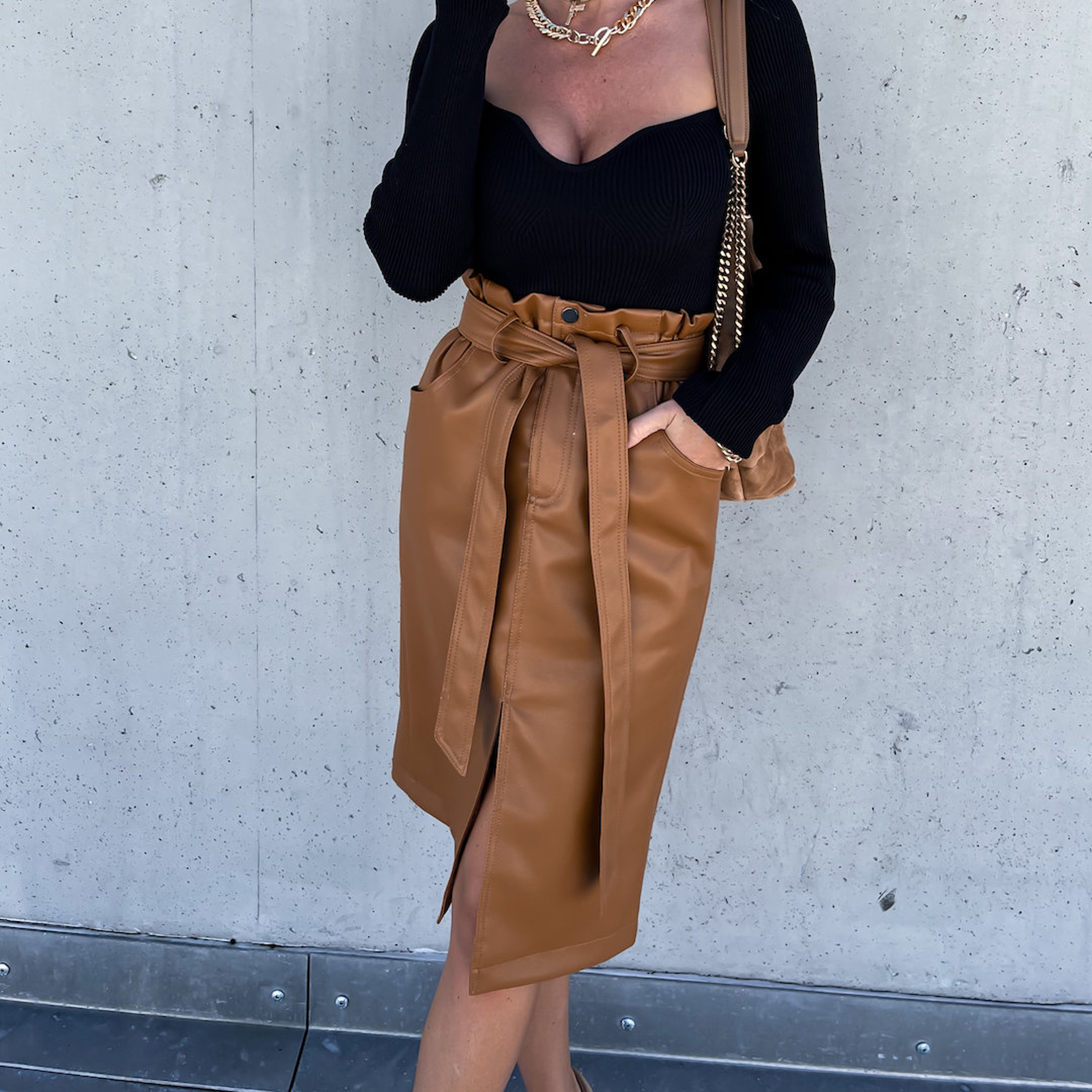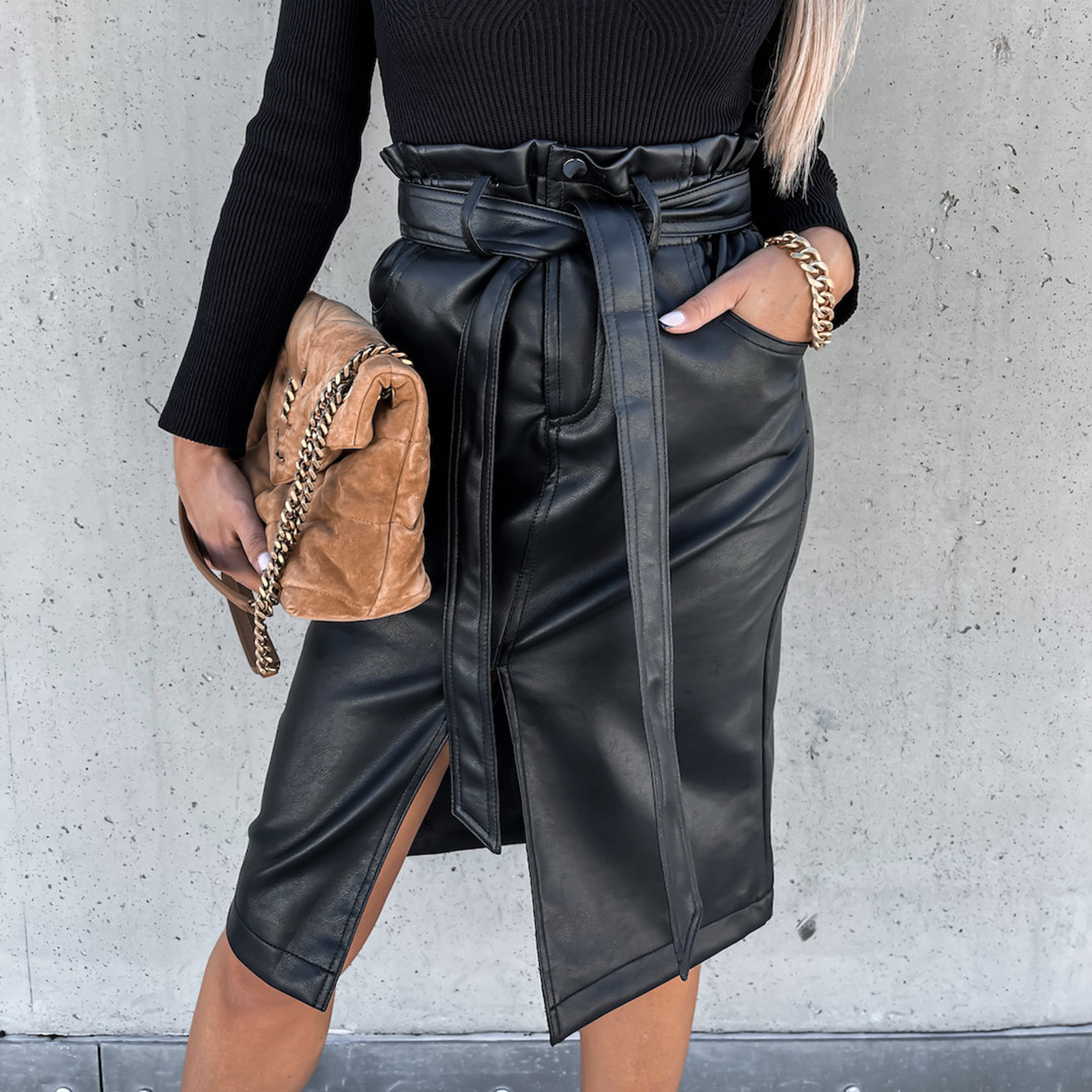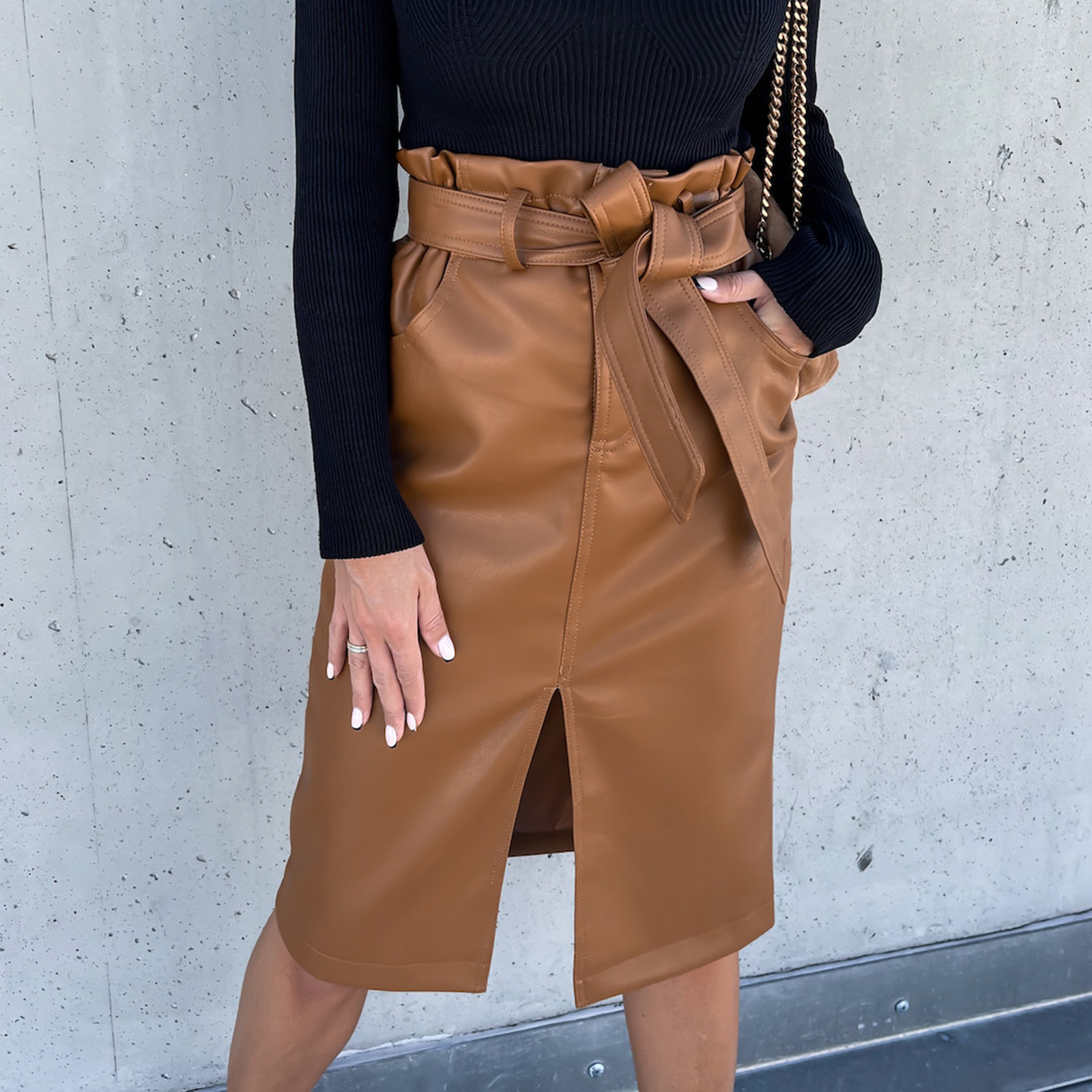 wsevypo Office Lady High Waist Drawstring Split PU Skirts Elegant Women's Faux Leather Wrap Bodycon Skirts Knee-Length