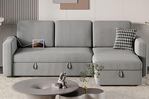 Maximizingspace in a room where every inch matters can be challenging, but notwith this L-shaped Convertible Sectional Sofa. It solves yourspace-saving needs by effortlessly transitioning from a compact L-shapedsofa with a chaise to a spacious double bed for two. With a roomystorage chaise, you can neatly store blankets and pillows under theseat, keeping them clean and out of sight. Better yet, you have theflexibility to set the chaise on the left or right of the loveseat toaccommodate your space requirements. This sleeper sectional sofa isequipped with 1 USB-A port and 1 Type-C port for more convenience.Simple setup required.