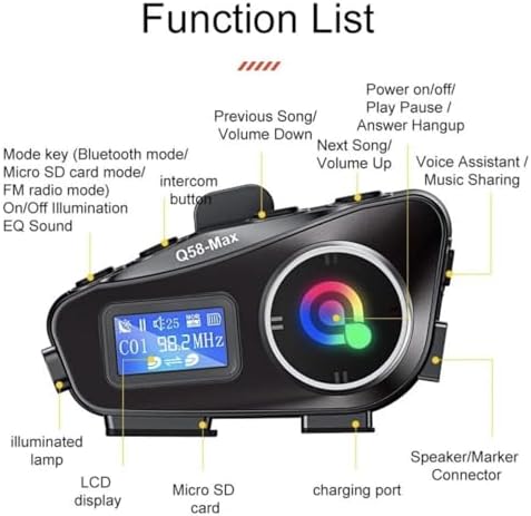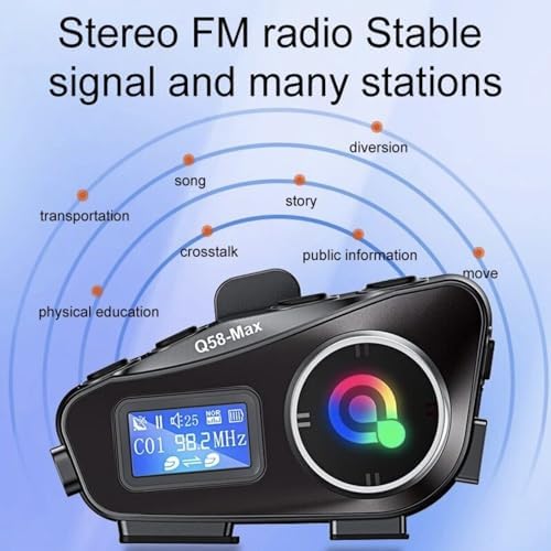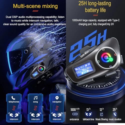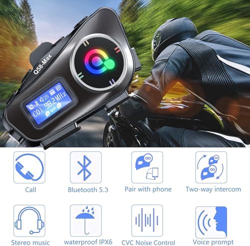 Motorcycle Helmet Headset with Intercom Communication, Suitable for 2 People, Maximum Range 500m, 40mm Speaker, Supports Music Sharing, High-Definition CVC Noise Reduction Call Music Control This motorcycle helmet headset allows clear communication between two riders up to 300 meters away. TheQ58MAX intercom system easily fits into most helmets, and the motorcycle helmet intercom features noise-canceling technology for clear, static-free calls, even at high speeds. This motorcycle walkie-talkie headset is IP65 waterproof, making it resistant to rain and moisture, so you can focus on your ride. Bluetooth Motorcycle Headset Bluetooth connection enables wireless operation, allowing you to maintain freedom of movement on your motorcycle. Users can seamlessly listen to music, answer calls or use GPS navigation applications with integrated controls. helmet bluetooth headset with intercom Enjoy enhanced safety and entertainment while exploring the open road with this top-of-the-line motorcycle intercom system.