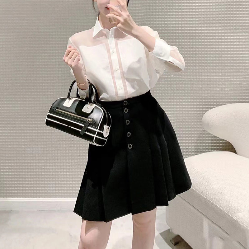 22 Summer Silk Wool Buttons Beige Skirt Women Casual Pleated Blend Black Skirts High Waist Single Breasted Texture Aline SkirtsA0557