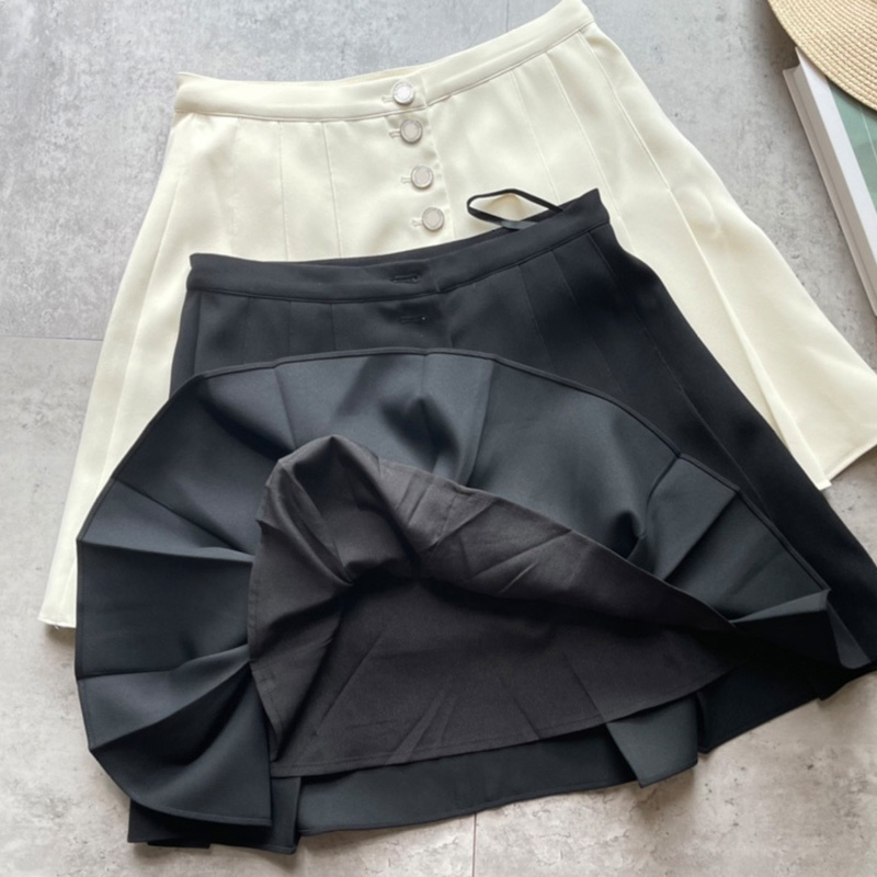 22 Summer Silk Wool Buttons Beige Skirt Women Casual Pleated Blend Black Skirts High Waist Single Breasted Texture Aline Skirts