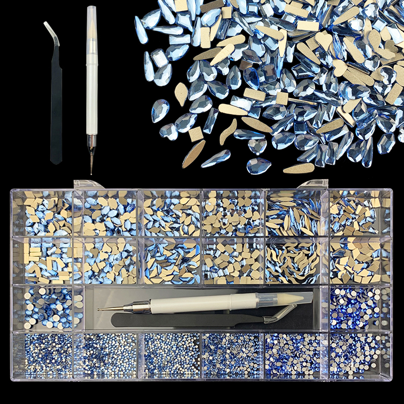 1). 2500pcs Rhinestone set: 300pcs(25x12) k9 crystal glass rhinestones, 2200pcs mix sizes round rhinestones, 1pcs wax pen(Crystal or white), 1pcs tweezers for free