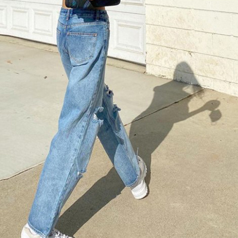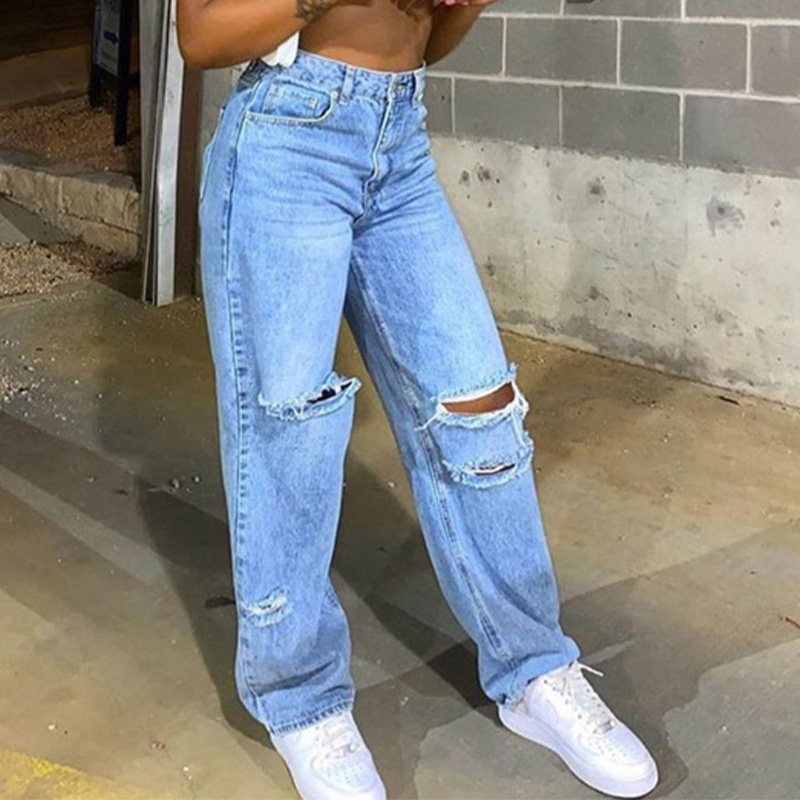 2XL Wide Leg Jeans Women Holes Ripped Jeans Hollow Out High Waist Zipper Fly Denim Blue Black Vintage Jeans Wide Leg Pants New