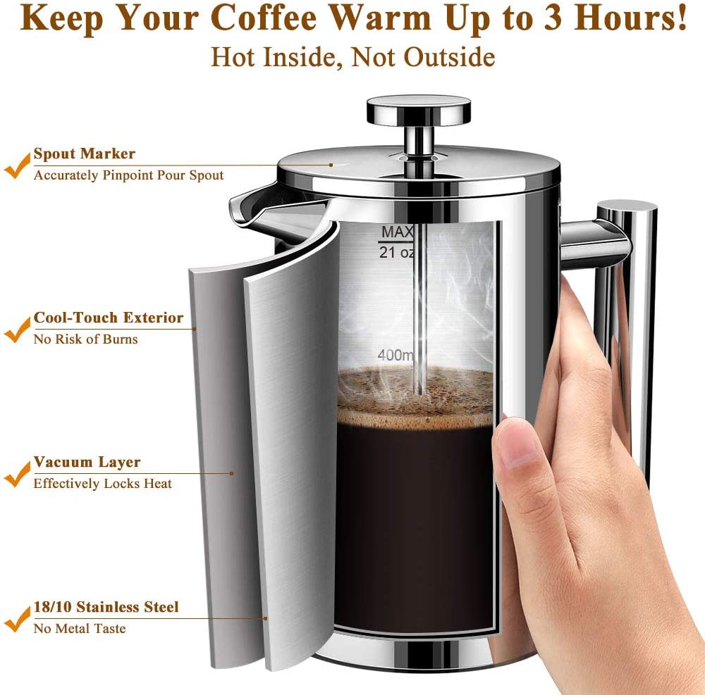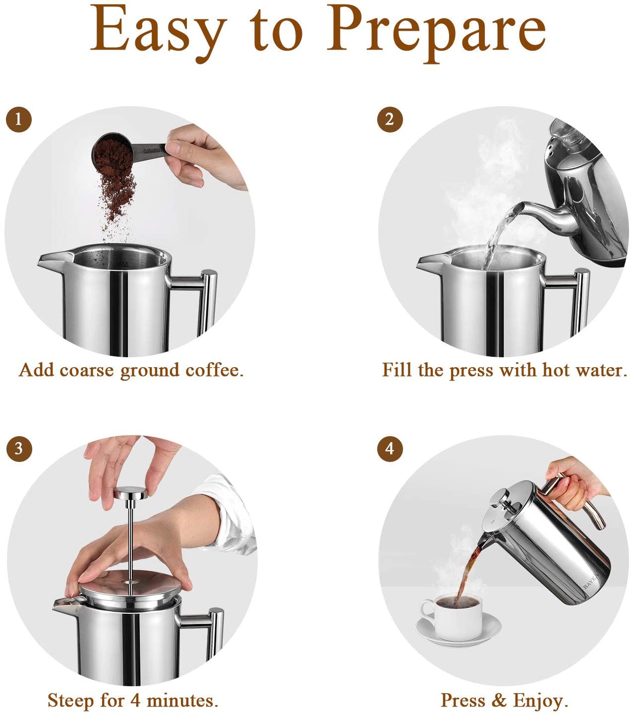 4 Minutes is All It Takes - Sleek and straightforward, french press coffee maker is convenient for anyone with limited budget, time or counter space. You just need 4 minutes to brew a rich and full-bodied cup of coffee at home or in travelling.