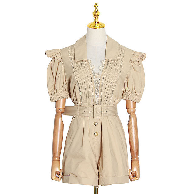 BUSHRA Casual Patchwork Lace Women Short Jumpsuit V Neck Lantern Short Sleeve High Waist With Sashes Hollow Out Playsuit Female
