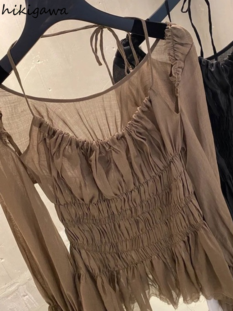 Blouse Women Sexy Off Shoulder Long Sleeve Thin Shirts Slim Folds Flare Sleeve Blouses Vintage Tops Femme Blusas De Mujer