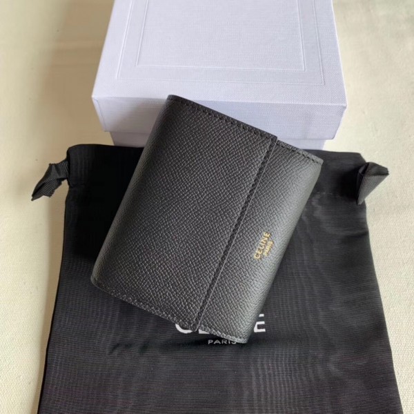 Crafted in grained calfskin leather by the House of Celine, this small trifold wallet with a flap offers enough space to fit into even a tiny bag or clutch, yet with space for coins, notes and credit cards, this neat wallet is the ultimate mini companion. Coupled with an elegant design with golden finishing touches.