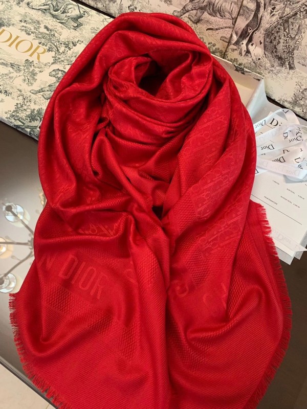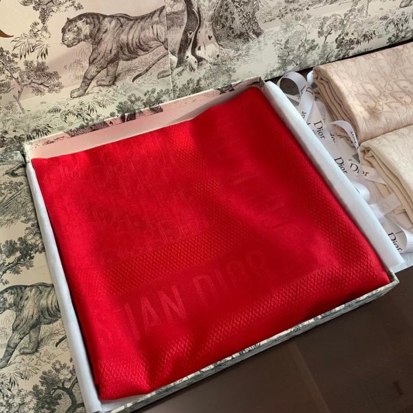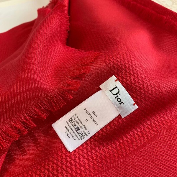 The red jacquard shawl features the Dior Oblique motif. Designed in 1967, the emblematic print covers the piece’s blend of silk, wool and cashmere. Fringed edges spotlight a tonal border with a ‘Christian Dior’ signature in capital letters. The shawl can be worn around the neck or draped over the shoulders.