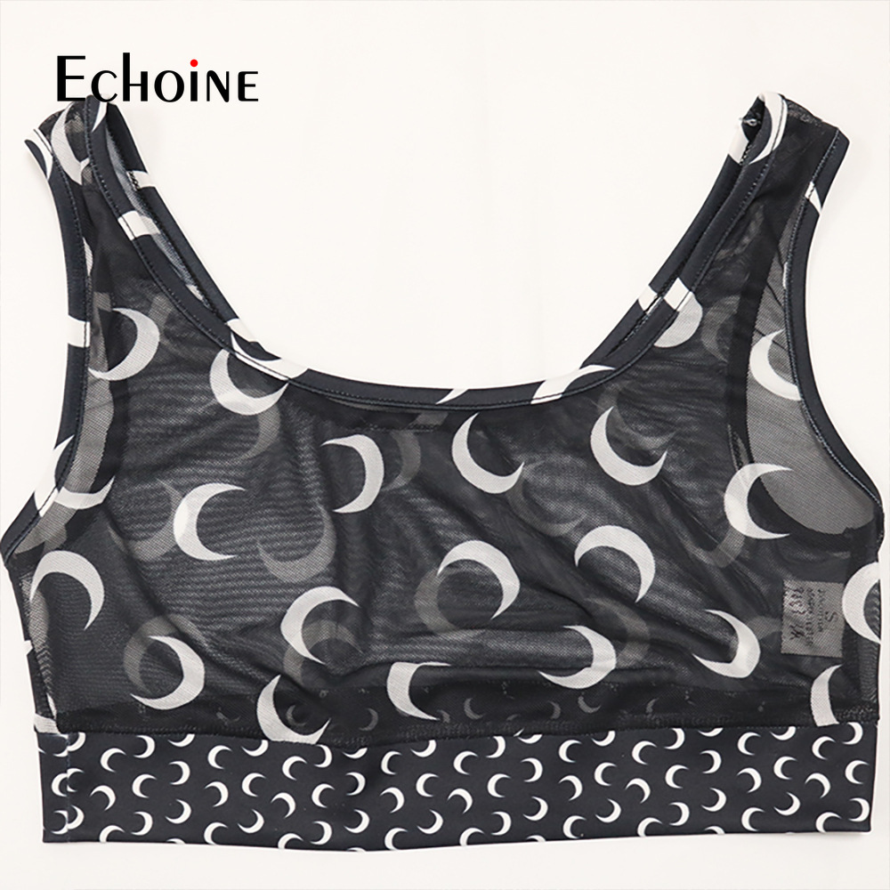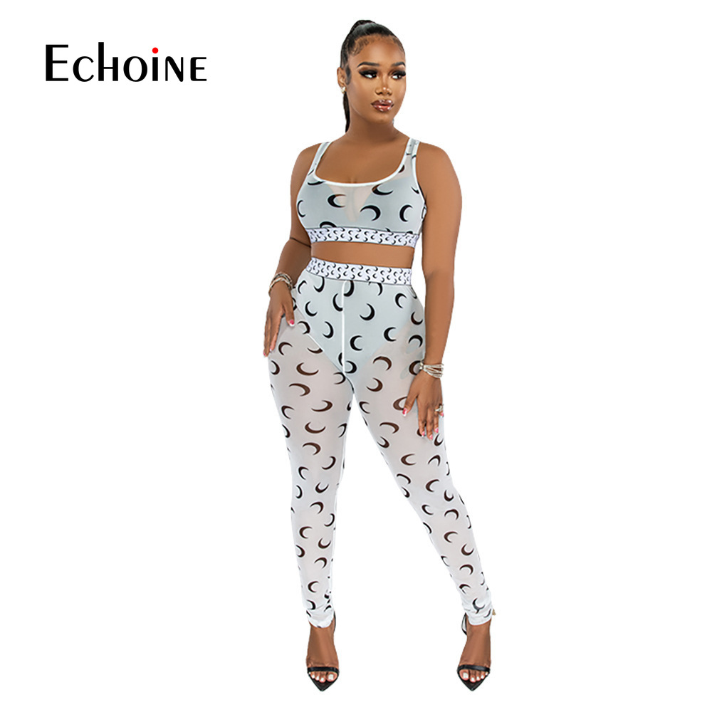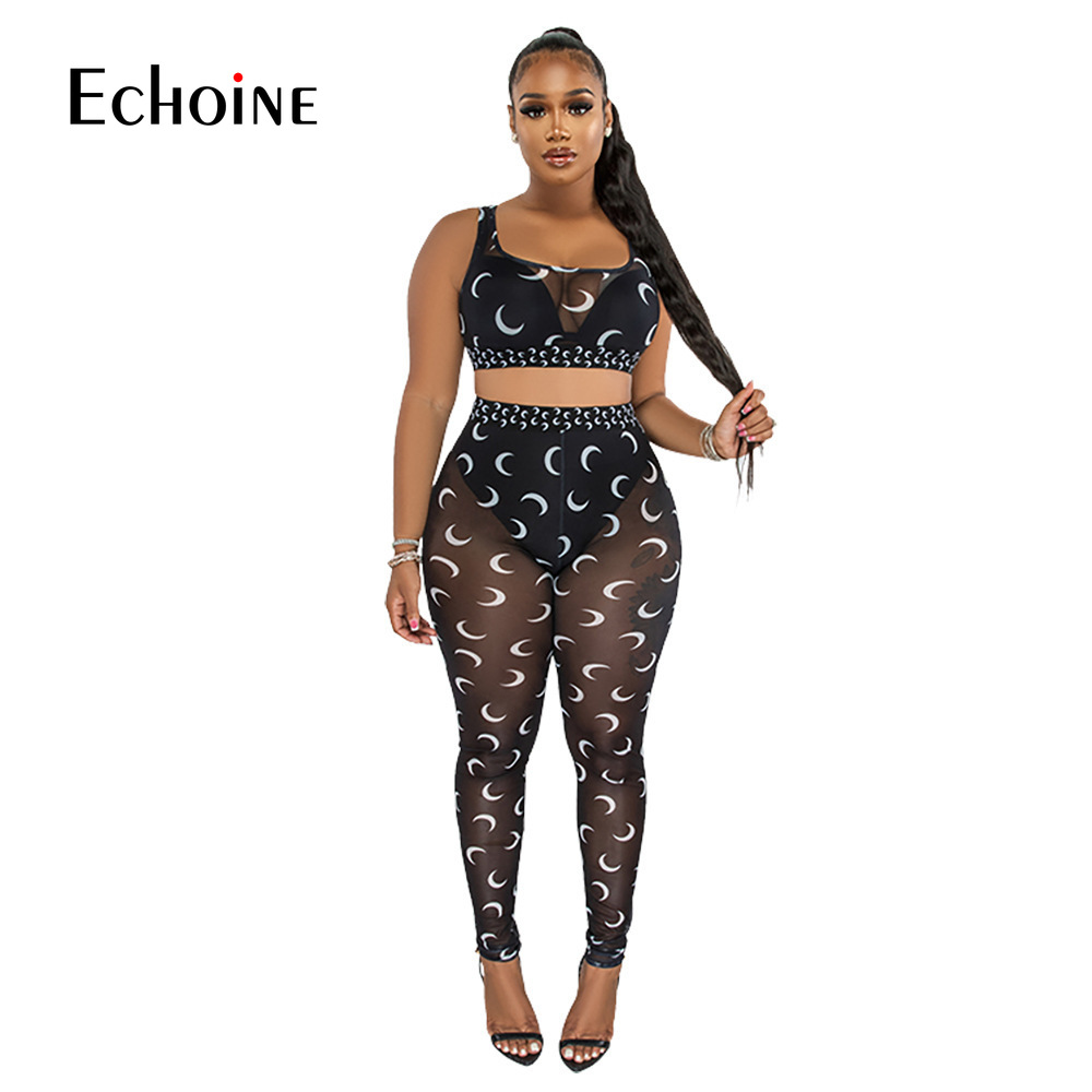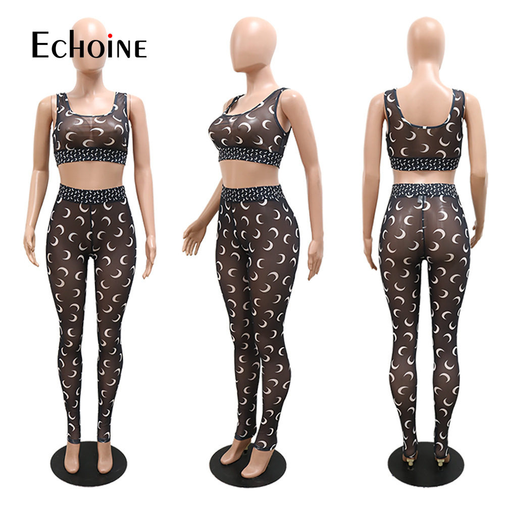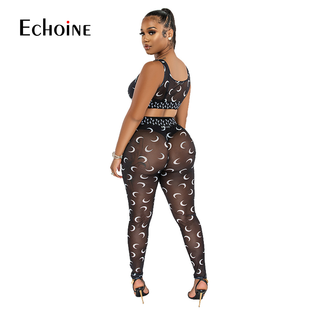 Echoine Women Sexy Moon Print Sheer Mesh Two Piece Set Club Suit Tank Crop Top Leggings Pants Party Nightclub Tracksuit Outfits